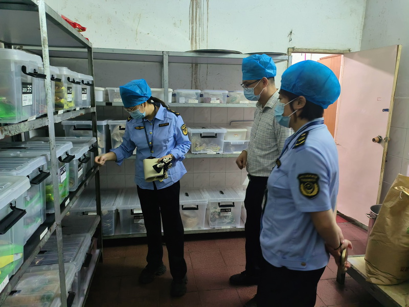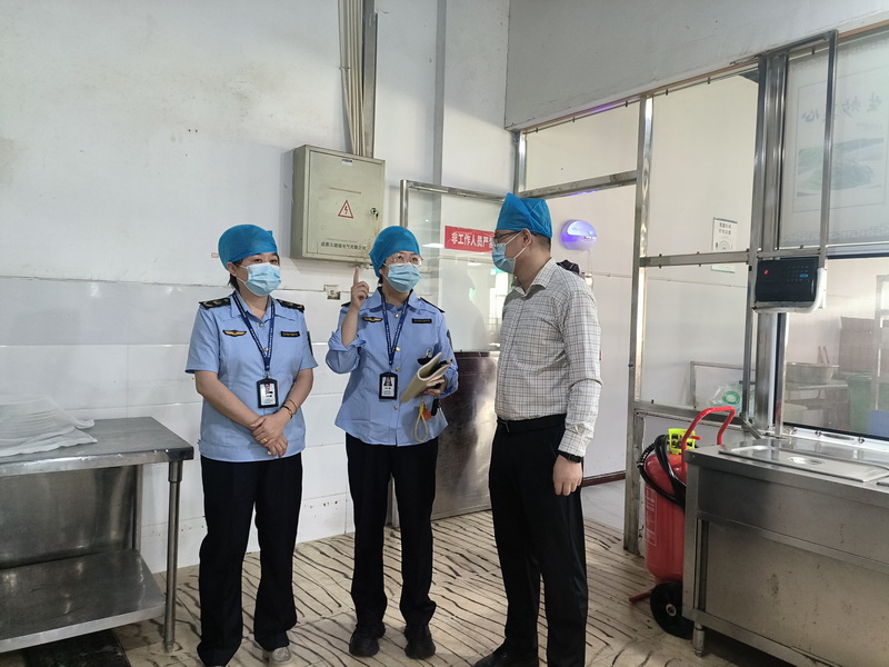 本网讯(文、图/龚金华)10月16日,乐山市市中区市场监督管理局所长马巍铁、副所长杨艳一行到校开展食品安全检查,饮食服务中心主任王斌及食堂管理人员陪同检查。