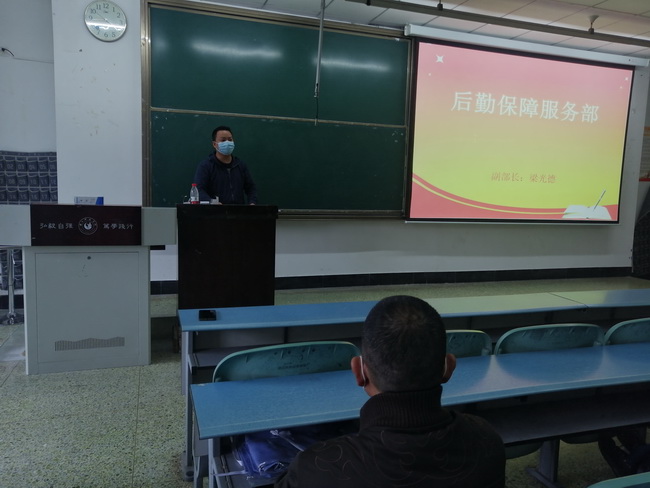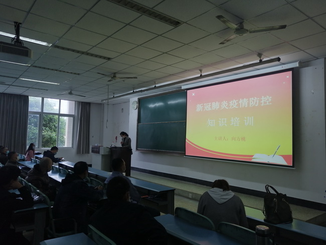本网讯(文、图/龚金华)4月23日上午,饮食服务中心和学生公寓中心组织部门全体员工,在行知楼125教室开展新冠肺炎疫情防控知识培训。培训会由学生公寓中心主任周彦杉主持,校医院院长向方桃主讲,后勤保障服务部分管副部长梁光德参会。