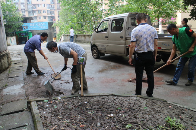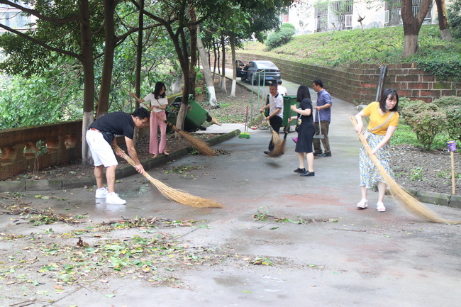 本网讯(文、图/代成刚)5月5日晚,乐山市中区遭遇狂风暴雨,导致校内公共区域部分树枝断落、大量树叶被吹落、部分道路积水、积淤泥等情况,严重影响了校内卫生。5月6日一早,副校长李朝晖组织后保部处、科级干部召开了突击排查安全隐患、突击开展卫生大扫除动员会。会后,各中心组织员工积极开展了安全隐患排查处置和卫生大扫除,副校长李朝晖亲自到现场检查、指导。后保部党总支书记古城、副部长(主持工作)袁明锋、副部长梁光德参加了卫生大扫除。